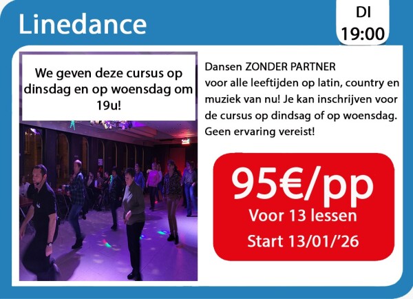 Start op dinsdag 13/01/'26 om 19u (13 lessen aan 95€/pp voor 13 lessen)