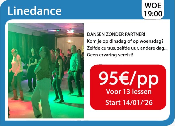 Start op woensdag 14/01/'26 om 19u (13 lessen aan 95€/pp voor 13 lessen)